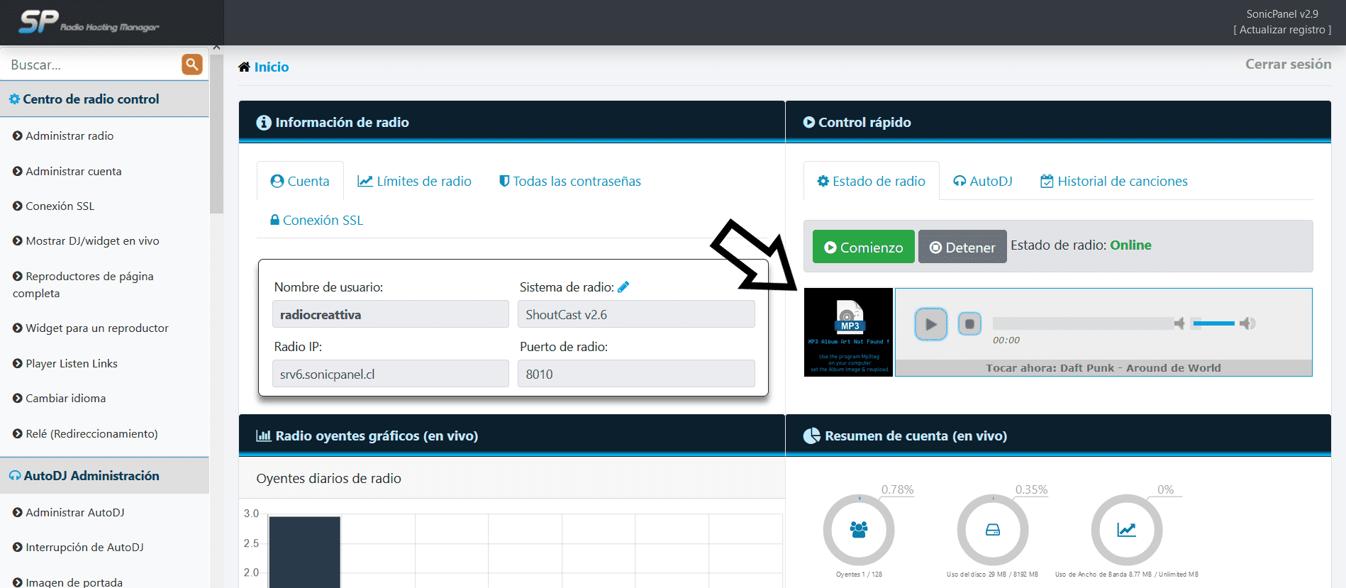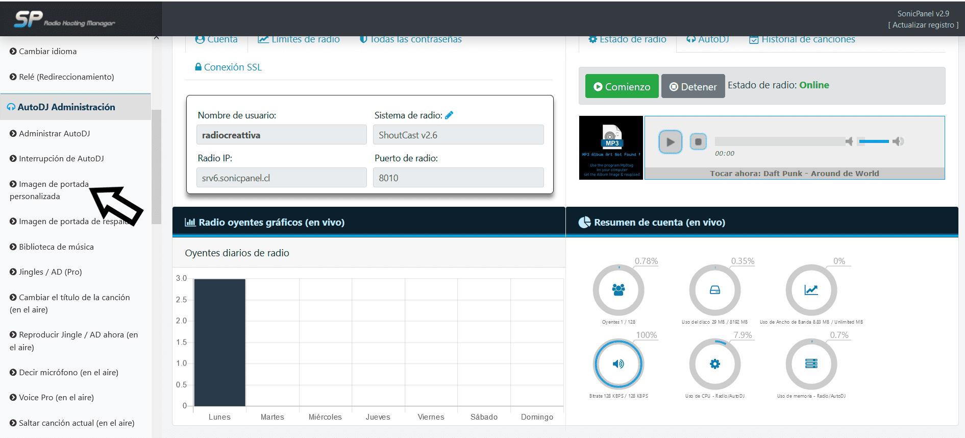 Para personalizar nuestro reproductor con una imagen propia, debemos ir al encabezado "AutoDJ Administración", y hacer clic en "Imagen de portada personalizada".
