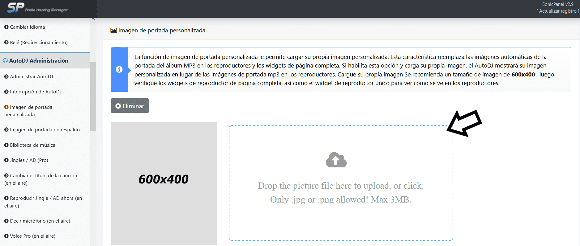 En esta pantalla, subiremos la imagen que nos gustaría tener en nuestro reproductor. En este caso, nosotros subiremos una imagen de 160x160px; aunque también puedes subir una imagen de 400x600px, tal como recomienda SonicPanel.